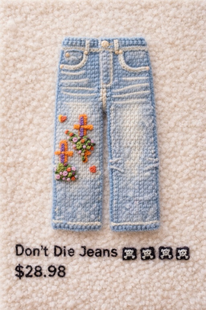 Don’t Die Jeans and Coffee Varsity jacket (Merch)